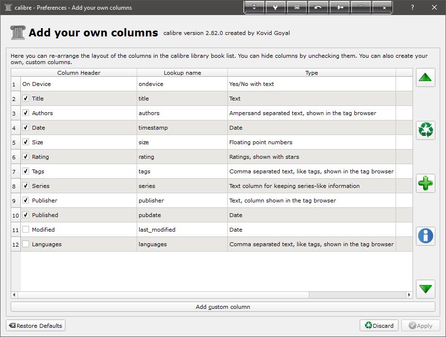 If I go to preferences and 'add your own colums' and then check the columns I want to add..press apply and everything is like I want it. But when I restart Calibre, then everything is the same as before the change the newly added colomn is not visible. What am I doing wrong?? |