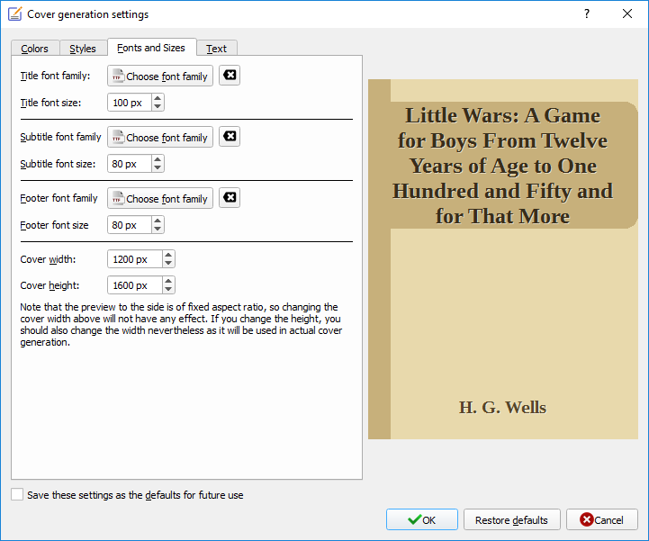 Reorganizing my books from an older (0.98) version of Calibre, really like the new Cover generation system. Except for the longer Title Subtitle combos I have on a lot of older 'Gutenberg' e-books. After manually editing the title fonts to smaller, I noticed the 'Cover Generation Settings' dialogue (Screenshot attached) has an option for a separate smaller subtitle font. "Great - I'll use *that*!" he said excitedly! Except, I'm not finding there's anyway to actually use that. Formatting the Title with ' : ' or ' - ' (and variations thereof) to indicate there's a subtitle does nothing, nor am I finding a field to move that too. Yet there it is in the interface, sticking it's tongue out and giggling that I could really make these Covers pretty and consistent if only I wasn't missing something obvious. Any help appreciated, Thanks Jonnan |
