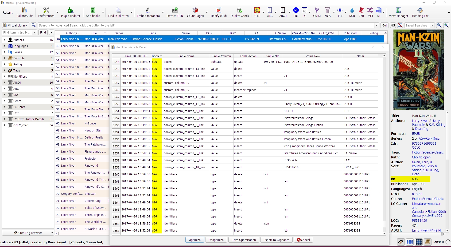 For example, if I change a misspelled tag, Los Angels to Los Angeles and it edits the tag in 18 books, I'd like that to be logged. Also is there a way to know what book # corresponds to what book? For example when it says book 30583 books_tags_link tag insert ... what's the easiest way of finding book 30583? Thanks! |
