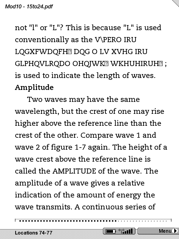 A good example is the wavelength definition - your 1-8a.gif file - and the rubbish at the end of the page is exactly the same: GLVWDQFH EHWZHHQ $ DQG ( RU % DQG ) HWF LV RQH ZDYHOHQJWK 7KH *UHHN OHWWHU ODPEGD LV XVHG WR So I would not disagree with bwaldron in that Amazon’s conversion mechanism is the same (or a very close similar) as the one used by the Mobipocket Desktop Reader. Final: I do think it’s useless for these kinds of documents. |