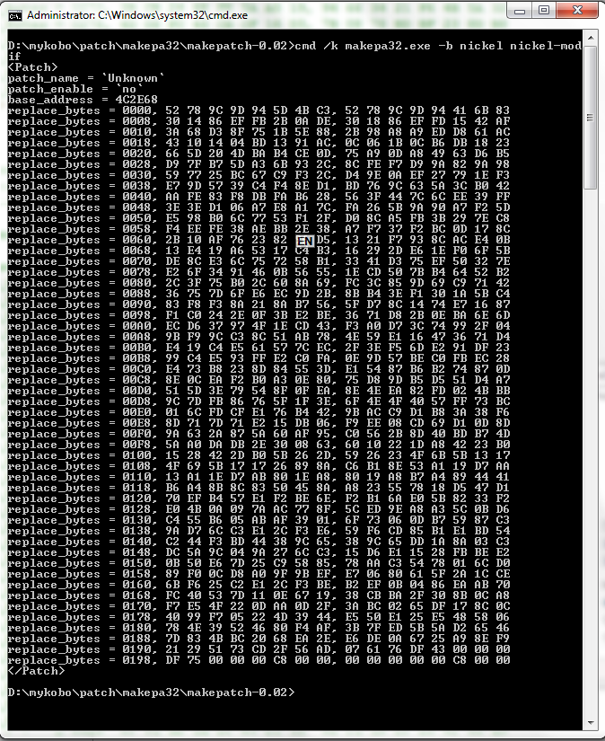 objdump works mainly with addresses, but the patch32lsb tool only deals with file offsets, so for some nickel and sickel patches it may be necessary to convert addresses to file offsets. If you use the -F switch with objdump it will show the file offsets along with the addresses. For example the objdump command: Code: