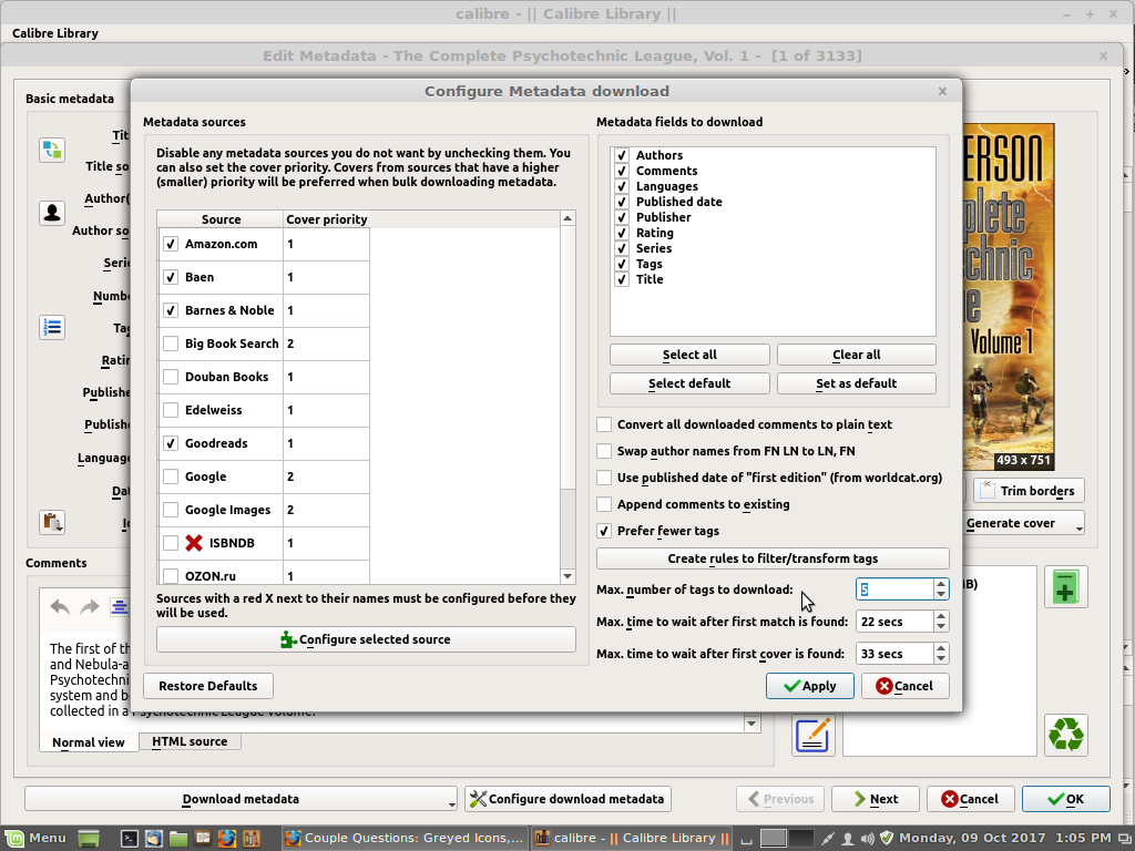 1. When I first installed Calibre (before version 1 was released), I thought it would place all my files into their respective folders by author First, Last name. When going into the folder today, I see that there are some in there like that and some in there as last, first. If I correct these with calibre/the metatag will it also update the folder in the main Calibre library? 2. What do the greyed out symbols mean? For example, in Publisher, I have quite of few (most) of the symbols in full color (in this case a green typewriter). I have some as a greyed out typewriter as well. What do those mean? Do they mean something within the metatag is incorrect? 3. Last question, is there a way to limit the tags to the top 5 or so? I know I can delete the extra ones, but I mean within the metatag search. Thanks so much. Last edited by ValerieAnne; 10-09-2017 at 01:56 PM. Reason: Edited Title |