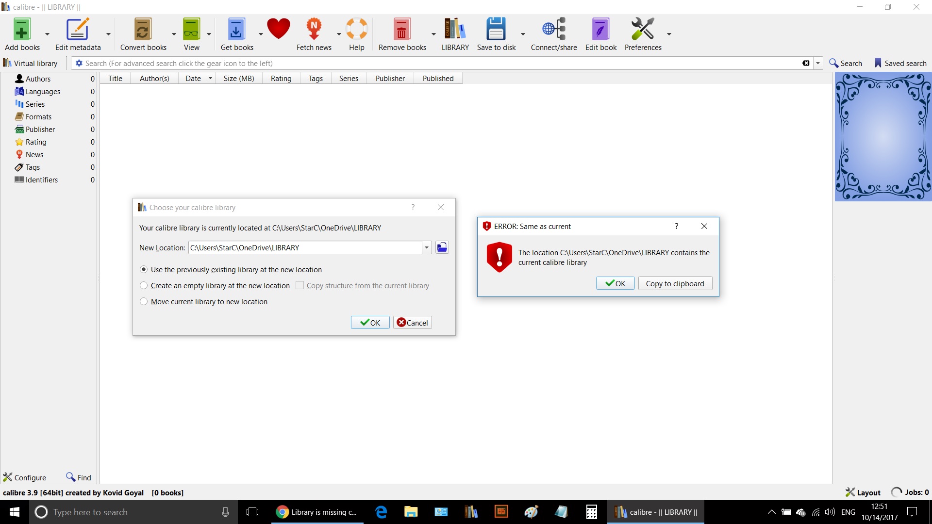 Hello all. Yesterday, I opened Calibre (version 3.7) and it was completely empty. Imagine my surprise! It looked like I had somehow moved my library file location, but when I checked, it was right where it was supposed to be. I attempted to point Calibre at the correct location, but when I selected the folder with the files, it said "the location contains the current library" and wouldn't do anything. All the folders are there, with the ebook file, cover file, and metadata file. I've lost nothing, it just refuses to display in Calibre. I tried moving the entire library to a different folder and then pointing Calibre at it, with the same results. I downloaded the latest version of Calibre (3.9 now), and it displays exactly the same. I don't want to blindly take any further action because I don't want to risk losing what I have, but I also can't use any of Calibre's features if it won't display the books.
