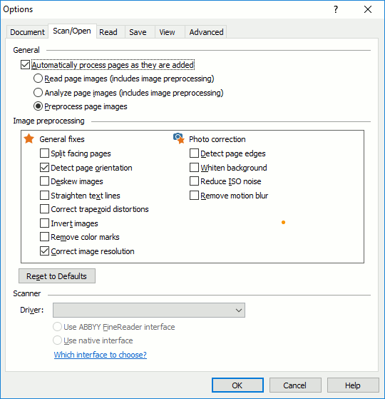 If you get these types of distortions, maybe it would be best to tell Finereader to not preprocess your images at all. Again, you could go back to Tools > Options > Scan/Open + uncheck the "Automatically process pages as they are added" box. |