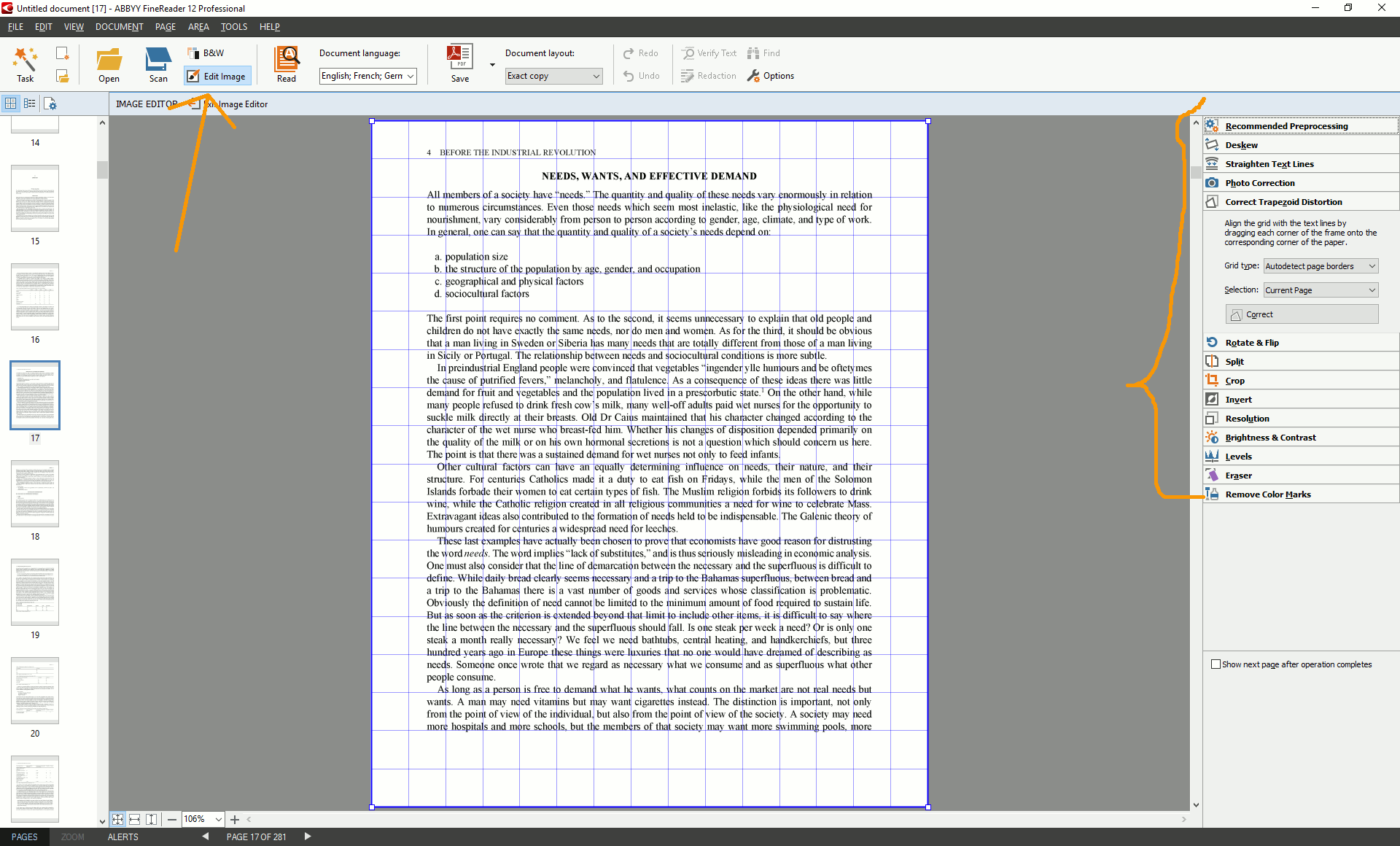 Abbyy Finereader 12 for Mac has no problem doing OCR on the page images, even the ones with Greek (impressive). What I can't figure out is why it takes a random page and distorts it? Badly in most cases. I always double check the scans before importing them into Finereader as I want to get good results the first time. Please see the before and after. I can't find any options to reset just a single page. I have tried using the perspective distortion to attempt to undo what Finereader did but I have no success. I've removed problem pages like this one, finished the remainder and then tried to import the pages again. The same severe distortions happen again. I've opened the problem pages in Prizmo and it has no distortions but the OCR leaves much to be desired. Is there some tip or trick for getting Finereader to leave these random pages alone and just our them? |