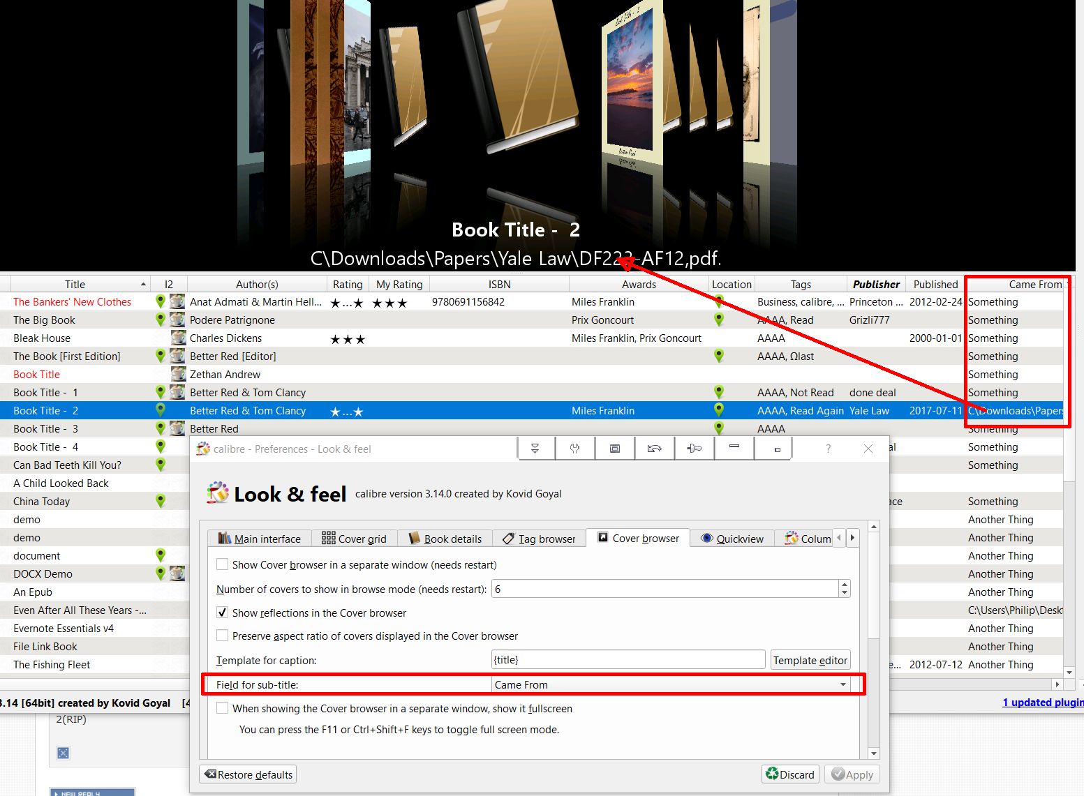 Just put your Read column where I have Came From. But if you change Read in the book list it won't change what's shown in the cover browser dynamically, you have to reselect the book in the book list (i.e. down arrow/up arrow). BR |