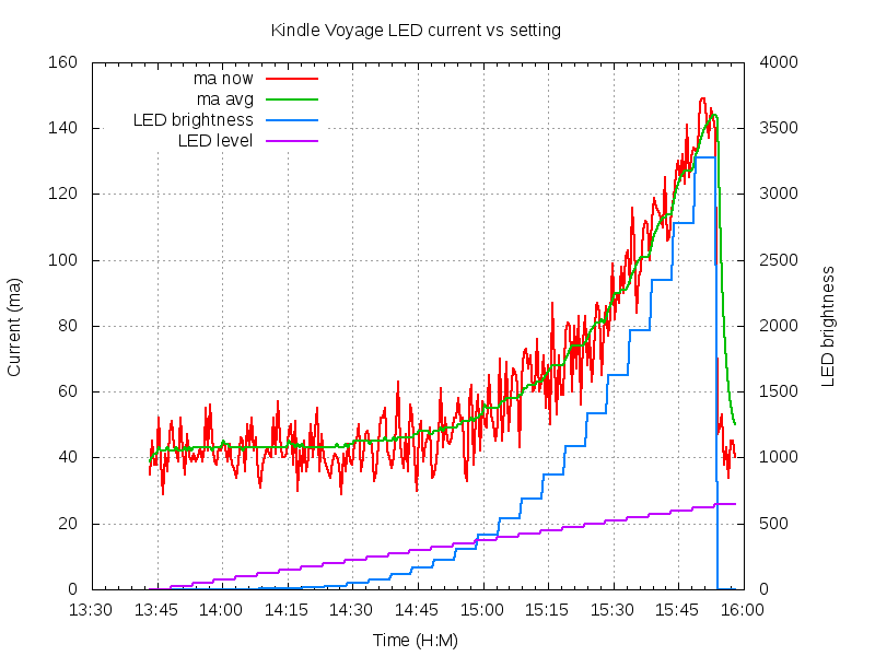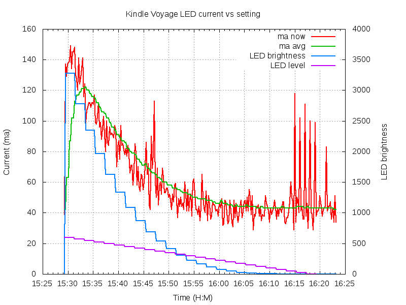 But it turns out that the linux device driver for the Voyage power supply exposes some useful information in /sys/class/power_supply/max77696-battery/, including current and voltage, now and averaged, which can be accessed on a jailbroken device. In addition, there is a directory /sys/class/backlight/max77696-bl/. (I suspect amazon inherited a device driver assuming a phone or PDA.) I made a table of /sys/class/backlight/max77696-bl/actual_brightness value versus Voyage brightness setting, which is plotted in the attached brightness.png for logarithmic and linear scales ( human brightness sensitivity is approximately logarithmic https://en.wikipedia.org/wiki/Weber-Fechner_law ). 10**(0.2*x) is also plotted for comparison. (I'm using 0.2 just because it is such a close match for the first half of the plot.) There is every reason to believe that the increase in power used for each step is larger than the increase for the previous step. The questions are how much, and does it matter? If you see no problem with how long your battery charge lasts, or don't care how brightness affects battery life, then it does not matter to you. Others might care or just might be curious. So far, I am in the curious category, but for the Oasis 2, I might also want to take power use into account. Anyway, I wrote RUNME.sh scripts to make battery discharge current measurements at each brightness level. The results are plotted in the attached led_ma* PNG files. I've also included the scripts and measurement data in LEDma.zip attached in the next post . More later. |