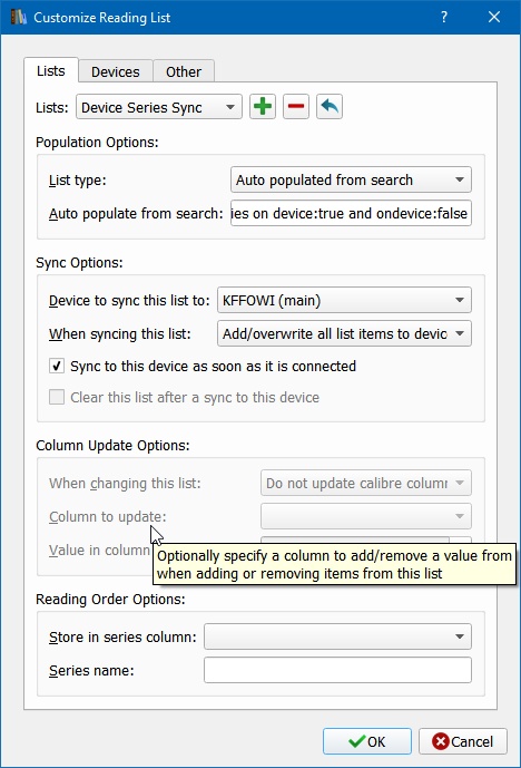 The Transformers So, should the code look like @The Transformers on device:true and ondevice:false or @"The Transformers" on device:true and ondevice:false Also, is "device" supposed to be replaced with the specific device name or does it already understand which device this is after successfully completing step #3? Finally, if I want to sync multiple different series in this way, and still want each series to show up as a separate series in Calibre Companion, do I need to create a new list for each series, or can I get multiple different series in one list? Last edited by American_Desi; 03-24-2018 at 01:30 AM. |