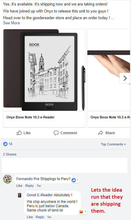 I am in the USA. I was about to buy a remarkable tablet for an out of country trip at the end of the month. I saw the Onyx Boox note was available on March 19... Says it right here... https://goodereader.com/blog/electro...ble-march-19th Their facebook says its available! They are shipping from Canada! https://i.imgur.com/aOhNjr8.png Well I can order from Germany or Canada. GoodeReader prices are NOT competitive. They have been called out on this but they explain that they get items to people that don't have a lot of access in their countries and pay a premium. Well I'm ready to pay a premium because of timing. Canada sounds like faster timing than Germany and GoodeReader (Canada) shows they have 20 in stock. No I didn't know about GoodeReader history of bad service and questionable dealings. So I message them to check that I can get the item on my timeline, it will go out "immediately" the next day (March 19!) if I pay right away. I pay right away. You can see the rest of the conversation where things obviously don't go that way: My chat with them: https://i.imgur.com/bRXtRtN.png I don't believe that GoodeReader has any Onyx Boox in stock. They are also misleading people about that and then going silent. Notice the March 19th post above, people are starting to complain they aren't being clear. But I didn't know that. Buyer Beware! Also note, "OURS IS IN THE US"... https://i.imgur.com/krh1BaR.png Here is the GoodeReader Onyx Boox Note website cached from google. This is how it appeared when I ordered. March 18, 10:00pm THEY HAVE SINCE EDITED IT. http://archive.is/W2wP9 Here it is today: https://goodereader.com/blog/product...-10-3-e-reader Archived: http://archive.is/IwdxS Sloppy add on at the bottom: Quote: