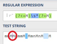 (?<=M)\s*(?=M) will fail when there is no space because there is nothing to match. Remember that lookbehind/ahead assertions dont actually match anything, they only serve as anchors.