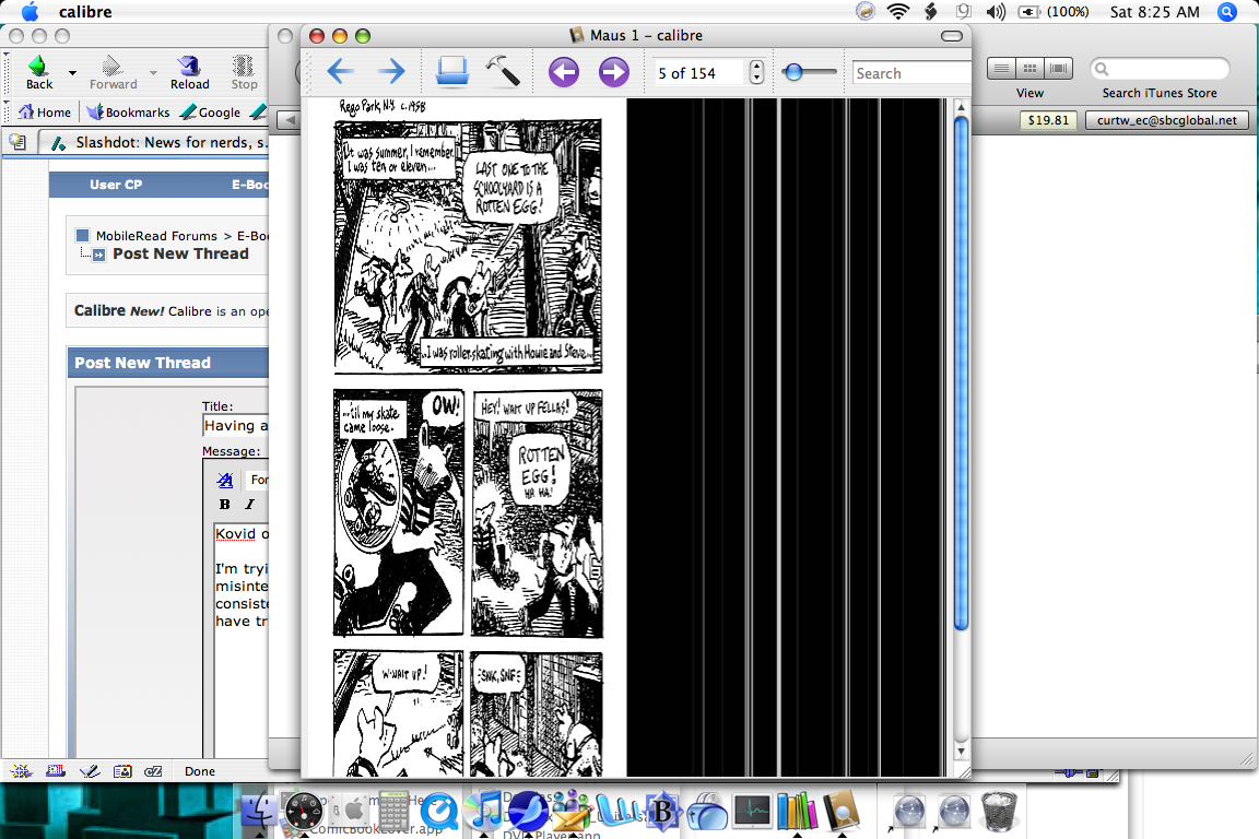 I'm trying to convert a large cbr file, but Calibre somehow seems to be misinterpreting the image dimensions. The images in the archive are not consistently sized, but most are approximately 1230 px tall by 850 px wide. I have tried converting the file both with and without the "keep aspect ratio" box checked, and both ways, I get the same results. The image is squashed from the sides, and black mostly noise is added (image attached). Can you tell what's going on? Because it takes two hours for this conversion to run on my old G4, I've also tried "manually" re-sizing and reducing colors and making an archive with just 10 pages. THAT conversion errors off with the following: Quote: