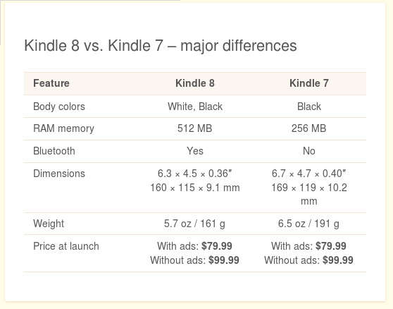 This comparison chart comes from EBookFriendly ... https://ebookfriendly.com/kindle-2016-white-black/ |