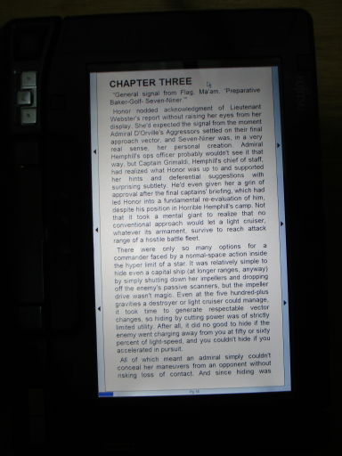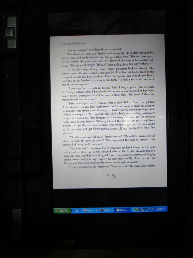 Thanks for the pics cyan. Very nice of you to do the side by side screen shots with Ebookwise and the Sony reader. The tablet actually has more "screen real estate" than I thought it would. It's still a contender for me at least. I'm also looking at the hp Pavillion 12.1 in tablet.