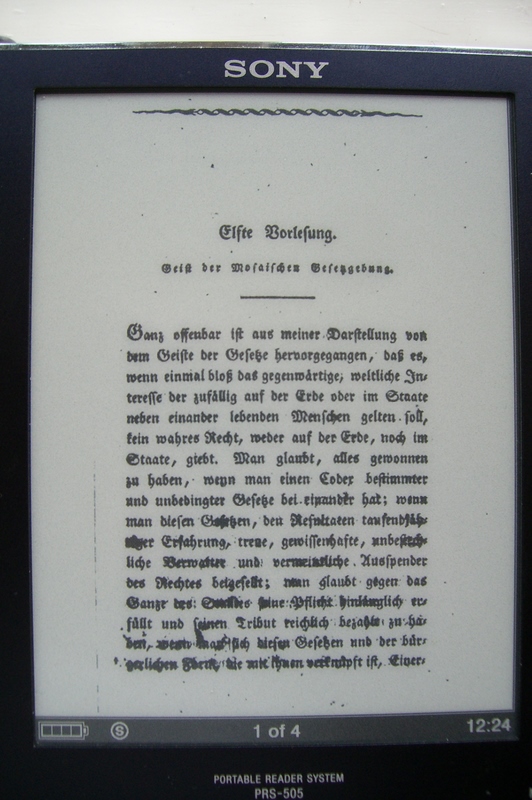 Second: I’m really interested in an e-ink-device. Considering price, weight, battery life, and file-formats, I’m thinking about the lbook (or bebook) or the CyBook. I prefer the latter because of the Mobi-Format (and, getting it in the UK or via justread, it’s cheaper). I'm from Germany, so perhaps the Sony PRS-505 or 700 is also an option (for the next future). But, of course, I have some questions about the devices It’s, of course, about the readability and getting stuff on it.I would like to read some classics from “Projekt Gutenberg” (the German version) or Zeno.org, and they are just plain text. So I think there should be no problems formatting them in a correct manner (I tried it via Mobipocket Reader and it was quite okay on the computer screen). But I would also like to read some really old things from Google's booksearch. These are scans and they are PDF. I knew about PDF and the problems on small e-ink-screens. But the books are not that big, about DIN A5, sometimes smaller. Sometimes up to 50 MB (but I can split them). With Acrobat Pro I could crop the white-space. I’ve done this for a file, I’ve attached (it's from Google). Is anyone here, who could load these file in his or hers Cybook (or Bebook or Sony Reader) and post a Screenshot? So I could decide for myself about the readability?