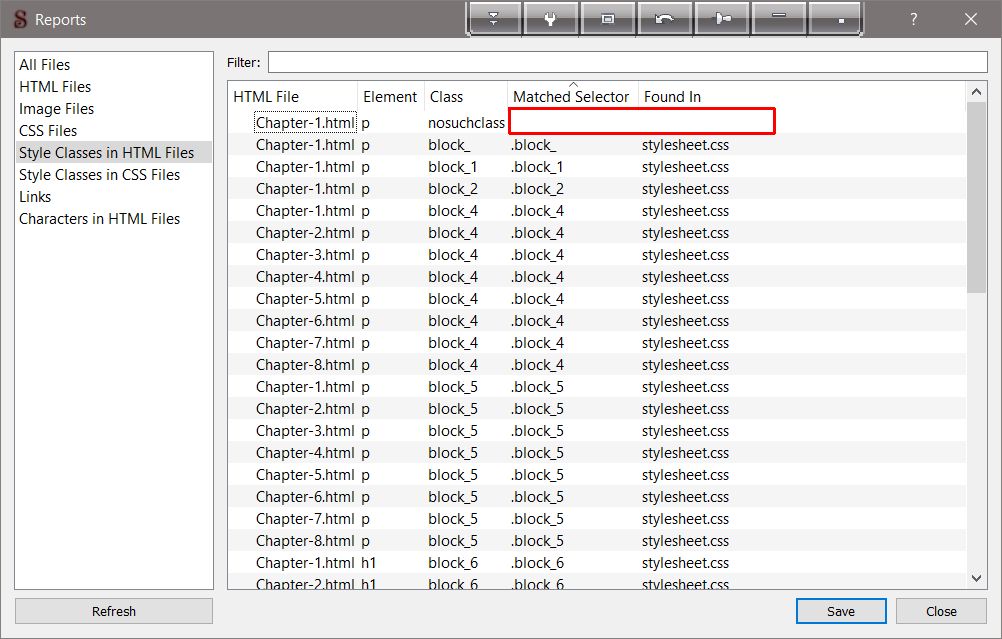<p class="nosuchclass"> text …. text<p> [Reports, Style Classes] will list it, and [Tools, Remove Unused CSS Rules] will delete it from the HTML ('See What Changed' shows it), BUT is there any way to just show or mark a class in the HTML that is not defined in a CSS or {Style}? I often clean up (at least that's what I call it) an epub to simplify overly defined classes that are 99% identical and make no difference on my reader. |