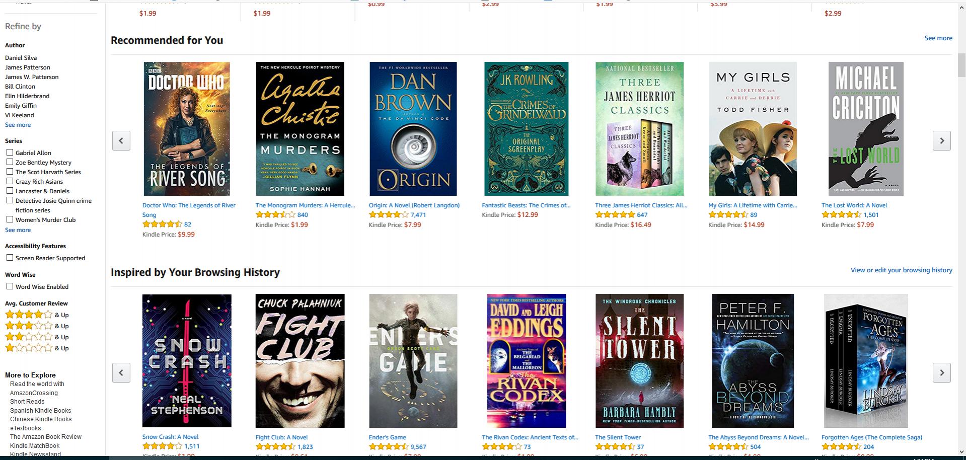 ![]() Are you confusing "Sponsored products related to this item" with recommendations? Within the store in the Reading app, I have several "For you in <genre-ish>" categories: SFF, Thriller, Short Stories, Movie/TV/Videogame Adaptations. Plus "Based on Your Browsing History", and "Top-rated <insert category here>", "New and Noteworthy", etc... Almost none of the books in those mentioned categories are KU books. EDIT: I just checked and I get nearly identical results on the website (though I don't typically use their website for books). Last edited by DiapDealer; 08-05-2018 at 09:28 PM. |