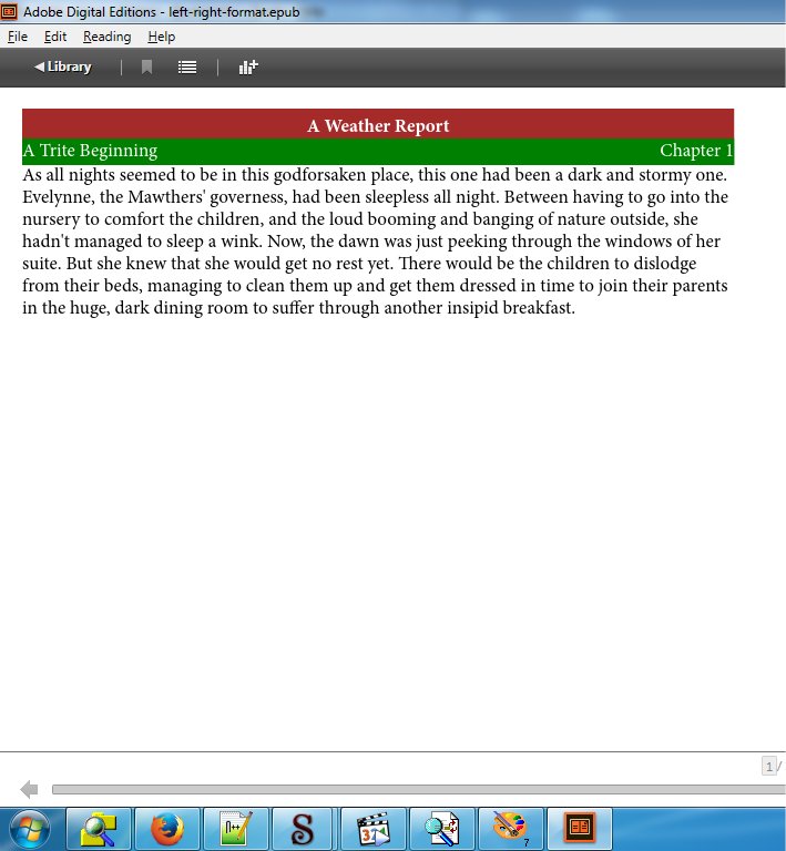 The first thing I've been working on is an attempt to have the second line of each chapter heading to have completely different formats. Specifically, I would like the first element to be left-aligned, and the second element to be right-aligned. After poring through suggestions all over the internet on how to accomplish this, the first image below shows the result of my labors. This has been accomplished by placing the following code into the stylesheet: Code:
