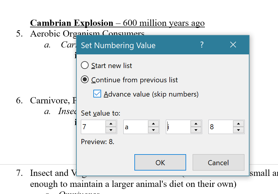 @kovid To generate this, I double click on the number, then right click on the highlighted number, then click "Set Numbering Value...", then click "Continue from previous list", then "Advance value, skip numbers", then change the value.