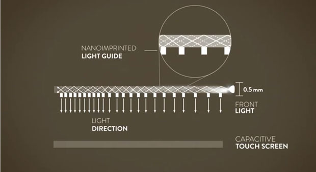 The light guide layer covers the entire screen so the light from the LEDs at the edge is spread evenly (in theory) across the whole screen. You are looking through that layer at the eInk screen itself. Basically, one side of the light guide is designed for total internal reflection while the other side has a pattern of holes to allow the light to escape so it strikes the screen and reflects back to your eye. Check diffuse or Lambertian reflection for more information on how this works. As I said, a dancing bear.