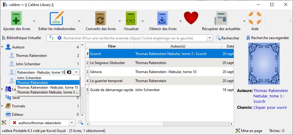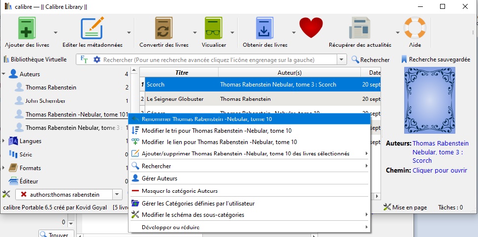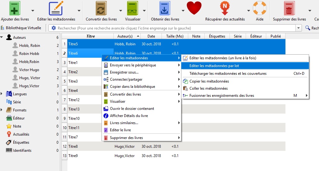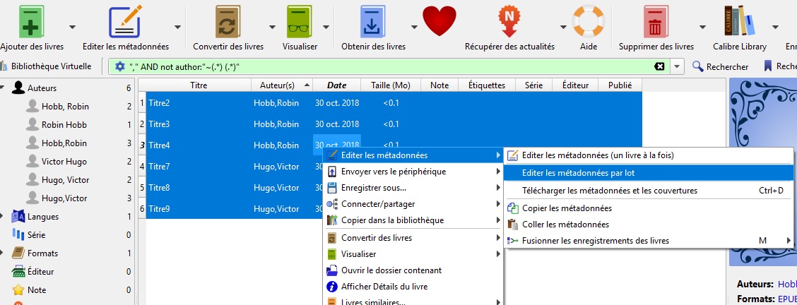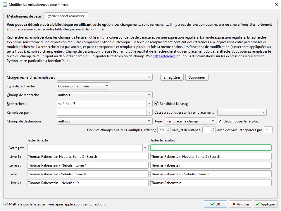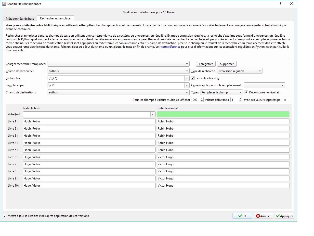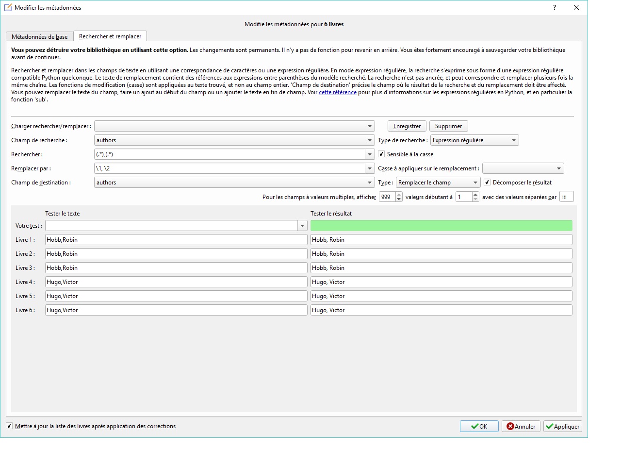 Je vais partir d'un exemple concret (Capture 1) avec 2 auteurs : Robin Hobb et Victor Hugo. Plusieurs possibilités 1 - Renommer l'auteur dans le volet latéral gauche : click droit sur l'auteur (capture 2) 2 - Sélectionner les livres d'un auteur -> click droit -> Editer les métadonnées par lot -> renseigner l'auteur -> OK (captures 3 et 4) 3 - Utiliser les expressions régulières : voir le tuto en français http://tutocalibre.free.fr/tuto_harmonisation.php 3.1 - Remplacer Hobb,Robin et Hugo,Victor par Hobb, Robin et Hugo, Victor (ajout d'un blanc après la virgule) Mettre dans la barre de recherche author: "," AND not author:"~(.*) (.*)" (capture 5) puis Rechercher (capture 6) Sélectionner tous les livres obtenus -> click droit -> Editer les métadonnées par lot (capture 7) Onglet 'Rechercher et remplacer' Dans 'type de recherche' sélectionner 'Expression régulière' Champ de recherche : authors Rechercher : (.*),(.*) Remplacer par : \1, \2 Champ de destination : authors (capture 8). Bien respecter la syntaxe dans les champs Rechercher et Remplacer par. A noter que le résultat obtenu est prévisualisé dans la colonne 'Tester le résultat' OK => repmlacement effectué (capture 9) 3.2 - Remplacer Hobb, Robin et Hugo, Victor par Robin Hobb et Victor Hugo Même principe que précédemment avec : Mettre dans la barre de recherche author: authors:", " (capture 10) et dans l'onglet 'Rechercher et remplacer' Rechercher : (.*),(.*) Remplacer par : \2 \1 (capture 11) Ok => (capture 12) De nombreux autres exemples d'harmonisation de la bibliothèque sont décrites dans le tuto 4 - Ajustement dans le volet latéral gauche L'affichage par défaut est par (prénom nom) des auteurs triés sur le nom. On peut préférer un affichage par clé de tri des auteurs (nom, prénom). Pour ce faire : icône 'Préférences' -> Ajustements (capture 13) Comme proposé remplacer categories_use_field_for_author_name = 'author' par categories_use_field_for_author_name = 'author_sort' Click sur 'appliquer les changements à cet ajustement' -> Appliquer -> Redémarrer Calibre (capture 14) Résultat obtenu (capture 15) |