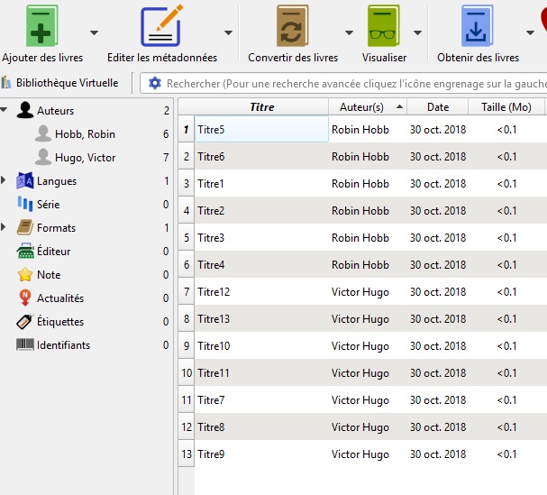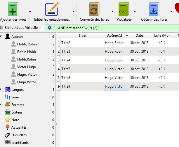 http://tutocalibre.free.fr/tuto_harm...on.php#auteurs Remarque : saisir le nom recherché en minuscules précédé par authors: pour n'avoir que les résultats de la colonne Auteurs(s) par exemple authors:victor hugo |