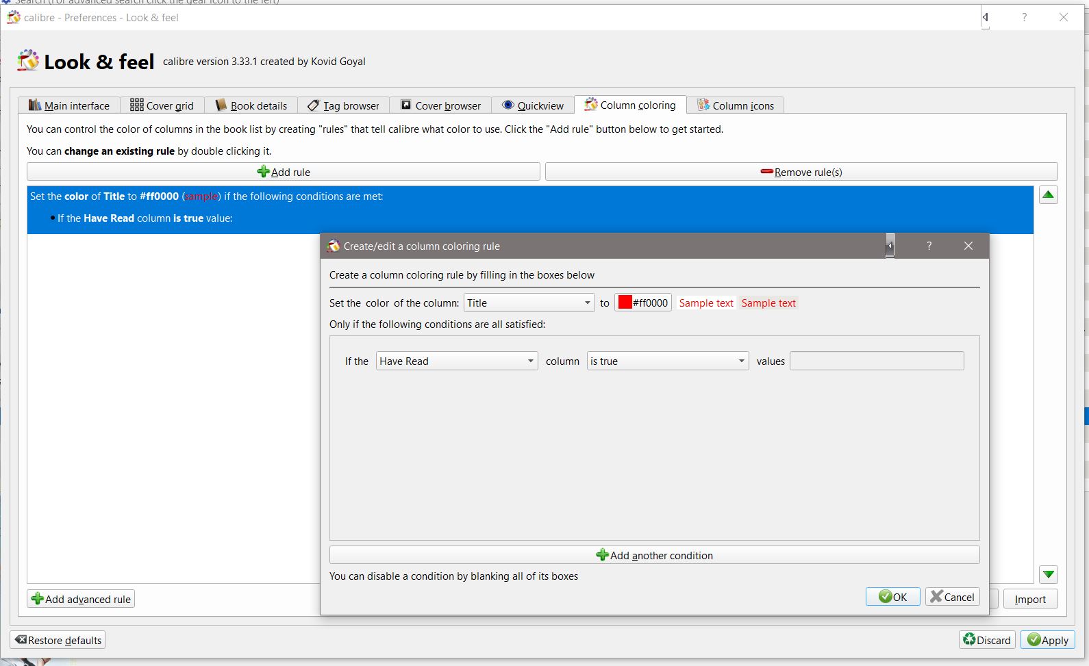 You need a column to indicate you've read the book, you could use Rating - something like the following (whilst Rating shows as stars internally its a number between 0 and 5). This colours the line Or you could create a Y/N custom column and do the following. This colours the Title Cell only. But IMO if you have a Y//N column you don't need to colour anything - Y/N columns are displayed as a Green Tick/Red Cross glyph. I think some e-readers can return a 'read' status to calibre, as can Calibre Companion BR Last edited by BetterRed; 11-06-2018 at 03:48 AM. |
