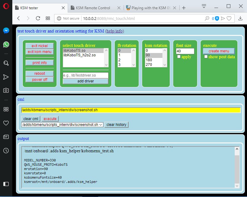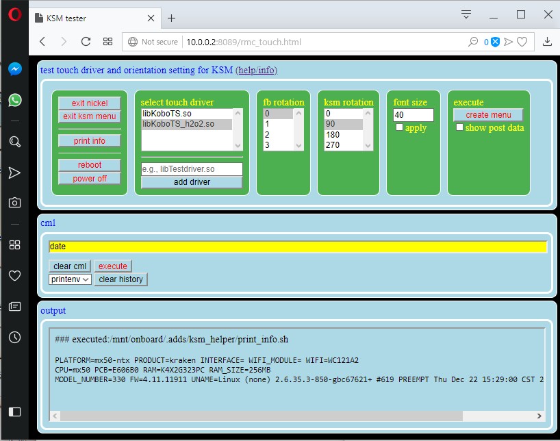 With each release of a new Kobo reader there arises the challenge to find out whether KSM will work on it, especially whether one of the available touch drivers can be used and which rotation values to set. Therefore I would like to provide a tool that facilitates this process.