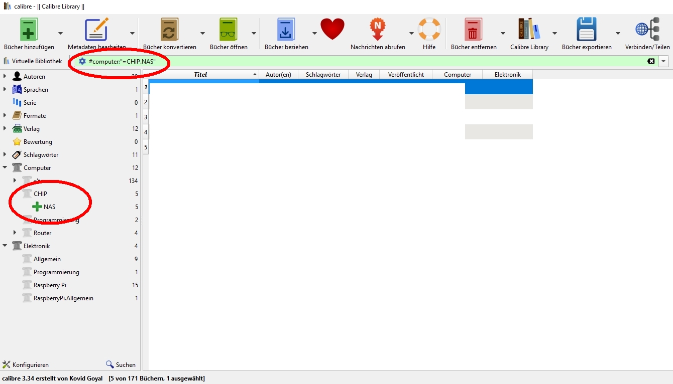 I just started with Calibre, but now I have problems to sort books in custom columns: 1. I generated two custom columns "Computer" and "Elektronik" on the same way. 2. I added user data to the "Computer" custom column (see Calibre-01.jpg, red markings) to generate a new subdirectory "CHIP" and in there the subdirectory "NAS". It works! 3. I added user data to the "Elektronik" custom column (see Calibre-02.jpg, green markings) to generate a new subdirectory "RaspberryPi" and in there the subdirectory "Allgemein", but it's not working. I have no idea what's the difference between both custom column (max. length of entries ???), but I don't found a solution for this problem. Thanks for any help!! Paul |