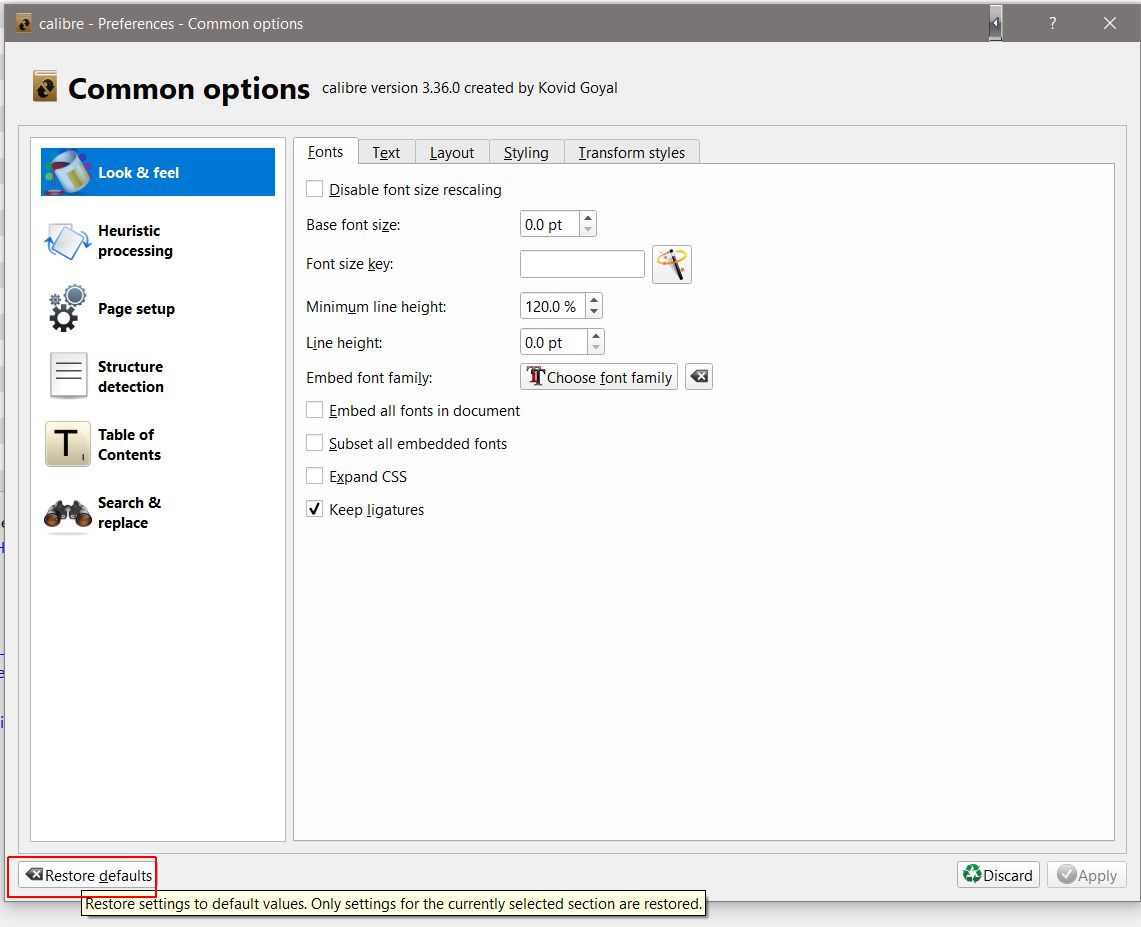 Given Calibre saves conversion options with every single conversion, a query like the above wouldn't actually help determine if one is using modified/book-specific settings like @Divingduck wants. I use EPUB on Android/iOS and MOBI (dual) on my Kindle so all my books have saved conversion settings. Or they would have if I didn't clear those out via bulk metadata edit quite regularly. (I try to clear saved settings immediately after conversion but sometimes I forget.) |