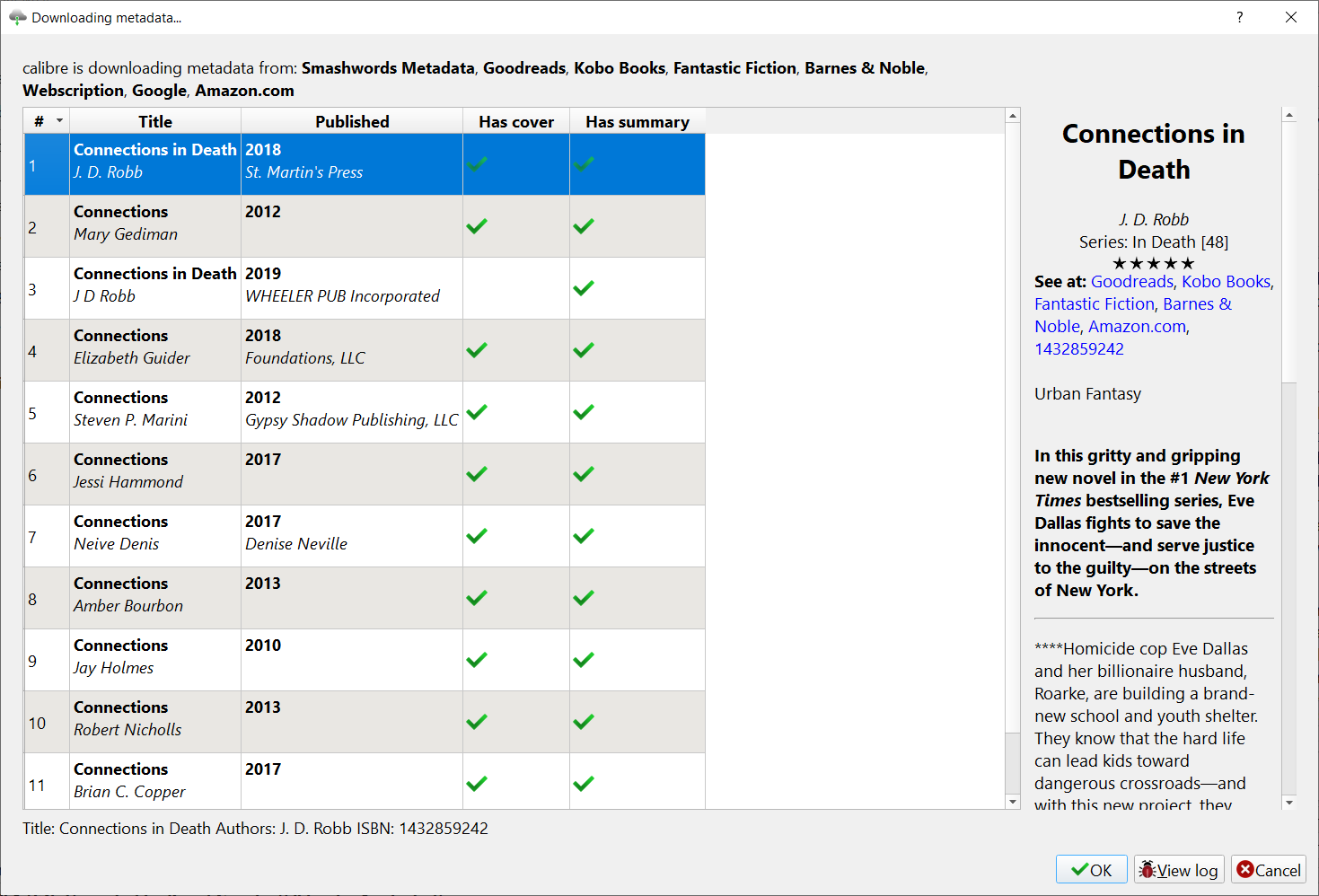 For me, the major issue with this plug-in is that it is very enthused about returning books with no matching on the author. For instance, I picked up Connections in Death by J. D. Robb, added it to calibre and did a metadata update. There were 11 items returned. Two of them were for Connections in Death, the other 9 were books with Connections as the title by 9 different authors. Testing on various other books gives the same over-enthused results.
