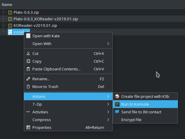 This is primarily aimed at brand new users, with the goal of getting things to work in the most fool-proof manner possible, by simply unpacking a single ZIP archive in the root of your Kobo eReader over USB. To make this possible, these packages bundle KFMon & NickelMenu. For existing users, if you're happy with your current setup, by all means, carry on! . Launchers are, by design, mutually exclusive: between fmon & KFMon, only the one installed last will be active, but where KSM is concerned, KSM will always take precedence, so this is NOT designed for KSM users.If you're curious as to what this actually does to original KOreader/Plato packages, the gory details are all here! Now that this is out of the way, on to the good stuff! As mentioned earlier, the installation instructions are dead simple, and can be automated by the script found in post #2: