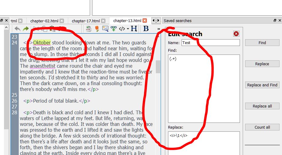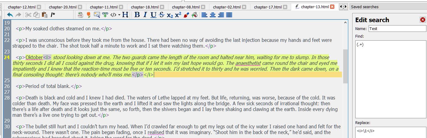 Double Clicked the word (Oktober) to select just the word, Ctrl-Shift-M to Mark it, and clicked Saved Search (Test) to [Find] Them Saved Search [Replace] Looks like the rest of the paragraph gets the <i> … </i> and not just the one word I was looking for Interestingly, it seems like the Marked area was extended to the rest of the paragraph also |