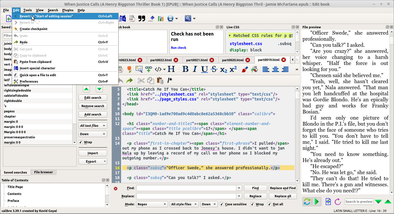 I have been a user of the Calibre editor from its beginning, but you can always trust me to get bitten... ![]() I was proofreading a book, and inserting a lot of corrections coming from a text page. After about one hundred of them (I had the feeling I had been saving my work from time to time), I just did a bad move and suppressed some words. Instinctively I hit the back button (à la LibreOffice) and was suddenly pushed back to the opening of the session. All my inserted corrections were gone (about one hour work). Of course, it's written. I am guilty. Yes. I think many users would be happy to be able to come back one step at a time. If we could choose in the Preferences the behaviour of this tricky back button (between last step OR last session), it would be a small step forward for civilization...