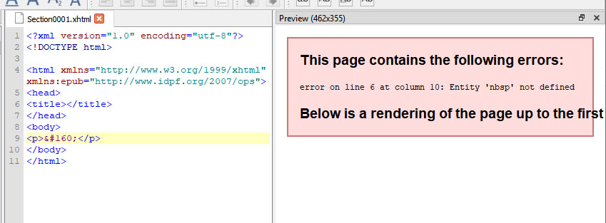 This is to prevent the nbsp characters from being converted to normal spaces when being processed in a QPlainTextEdit widget which happens due to a "design choice" in Qt (I would call it a huge bug but). That said, I am still not sure about how that image you postedcomes about. Perhaps your preserve entities are messed up in the sigil.ini file, or ? What happens if you right click on that page and run Mend? When the Preview auto updates, does it still have the same error message? |
