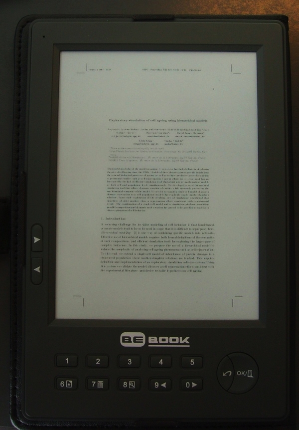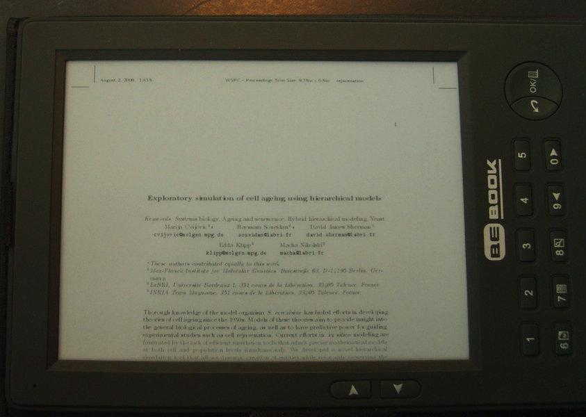 I've read most of the reviews for most of the devices available in France (PRS505, Cybook, Bebook) at a reasonable price. I'm on the edge of buying a Bebook, for its long battery life and more importantly, its PDF Support! Could somebody confirm this by posting some pictures of the bebook displaying this pdf : http://www.labri.fr/perso/soueidan/p...ell_ageing.pdf I'd interested by pictures of any page at the zoom level making it confortable to read for you... If you could give me your age too, I'd a happy and grateful fellow ![]() Thanks a lot ! |