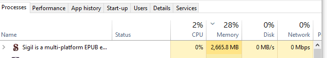 Windows Task Manager shows Sigil using about 140MB of memory. After working on the book for a bit look what memory use has increased to! Over 2GB. https://www.mobileread.com/forums/at...1&d=1559867211 And Sigil has become sluggish. It's not just with this one book. What should I investigate? Thanks. Sigil 0.9.13 Windows 10 i7 24GB Last edited by exaltedwombat; 06-07-2019 at 03:22 PM. |