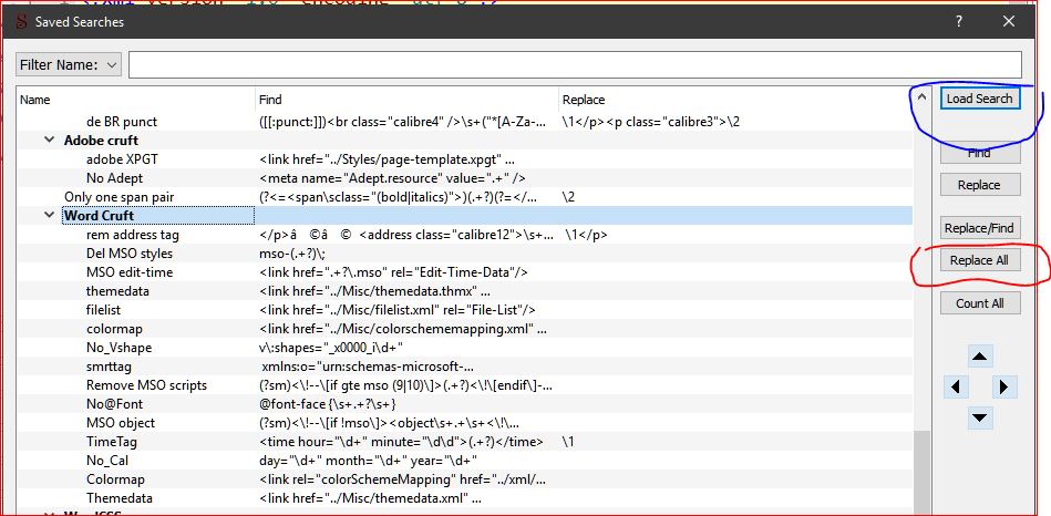 Tools: saved search Create a group of the individual saves (move them into the group) To use: Select the group (standard highlight), Click Load (blue circled), click Replace all (red circled) Note:All the Search and replace modes are STILL in control. That is where you set the scope and type. Current file or All HTML or CSS (must use current AND have focus) |