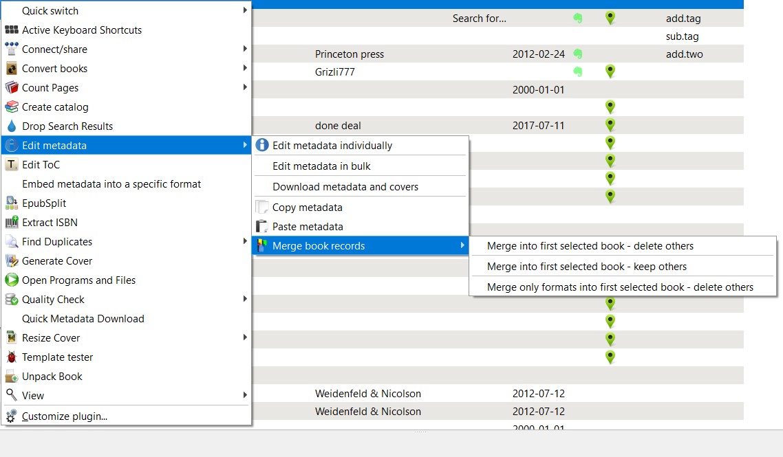 You can also merge via drag-dropping Book B into Book A, there's a setting in Preferences->Look and Feel to disable/enable that feature. Added: There are many GUI features that aren't explicitly documented. One way to find out about the hidden gems is to 'browse' the Preferences->Keyboard shortcuts settings, almost every action can be given a keyboard shortcut. The JobSpy optional plugin has a tool to list the active shortcut keys in a sortable list format. BR Last edited by BetterRed; 07-08-2019 at 05:24 AM. |