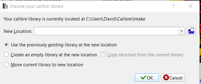 I installed Calibre on a new computer and copied the Calibre Library from an old computer. However, the library will not open on the new computer. I have duplicated the library and have it in different locations on my hard drive but neither are recognized.
