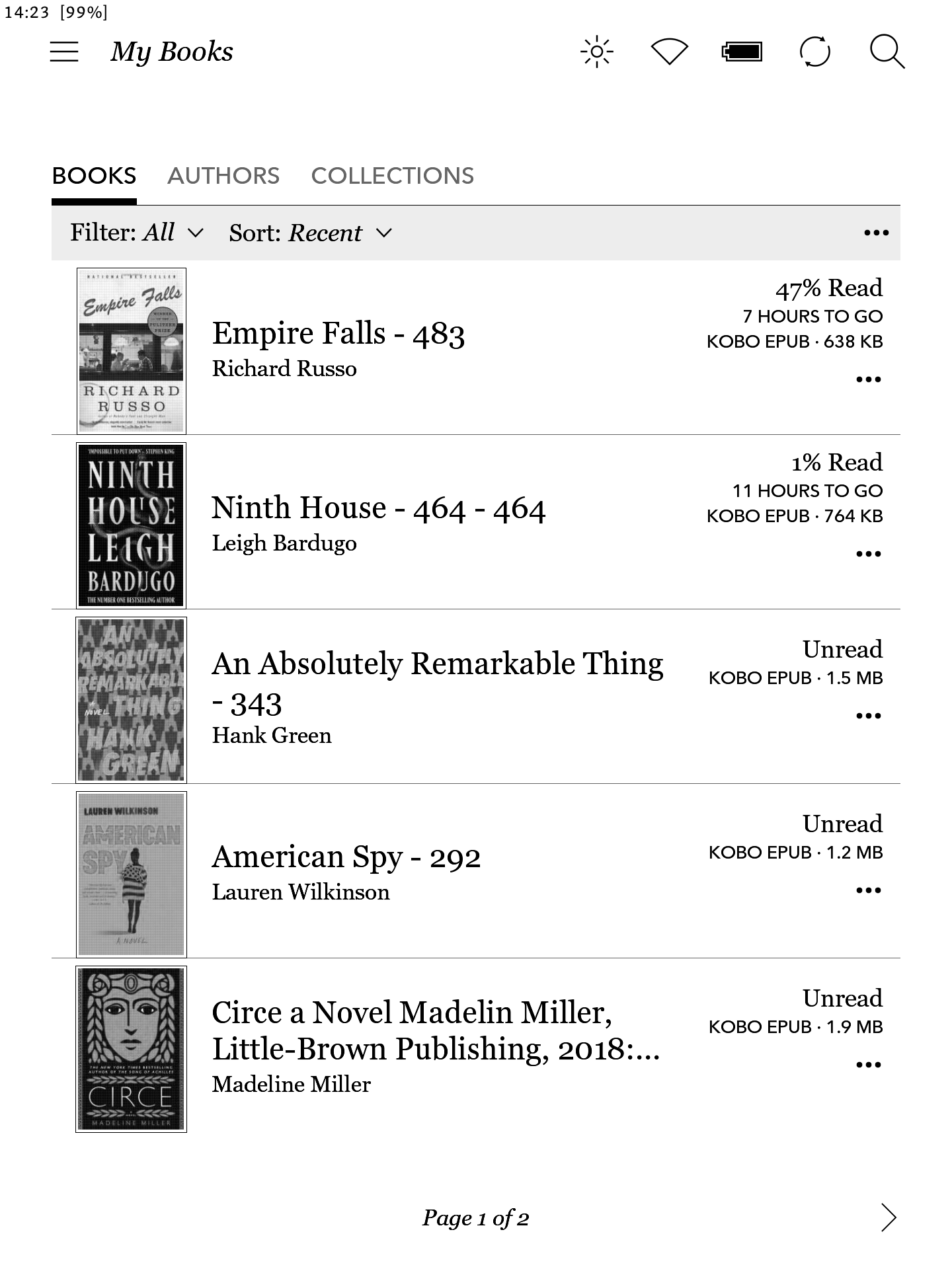 One thing i miss from Kindles is that on the list of books you have it gives you an idea of how long the book is with a series of dots. A long book will have lots of dots in a row, a small book will have not many dots. On the Kobo on the 'My Books' list of books the only thing re size is the size of the book e.g. 638kb. The only thing i have been able to do is use the Calibre plugin to change the book title to have the number of pages next to it - see attached. It is not ideal and quite ugly. Is there any way of changing the information on the right hand side where it says the size so it can show the total pages? |