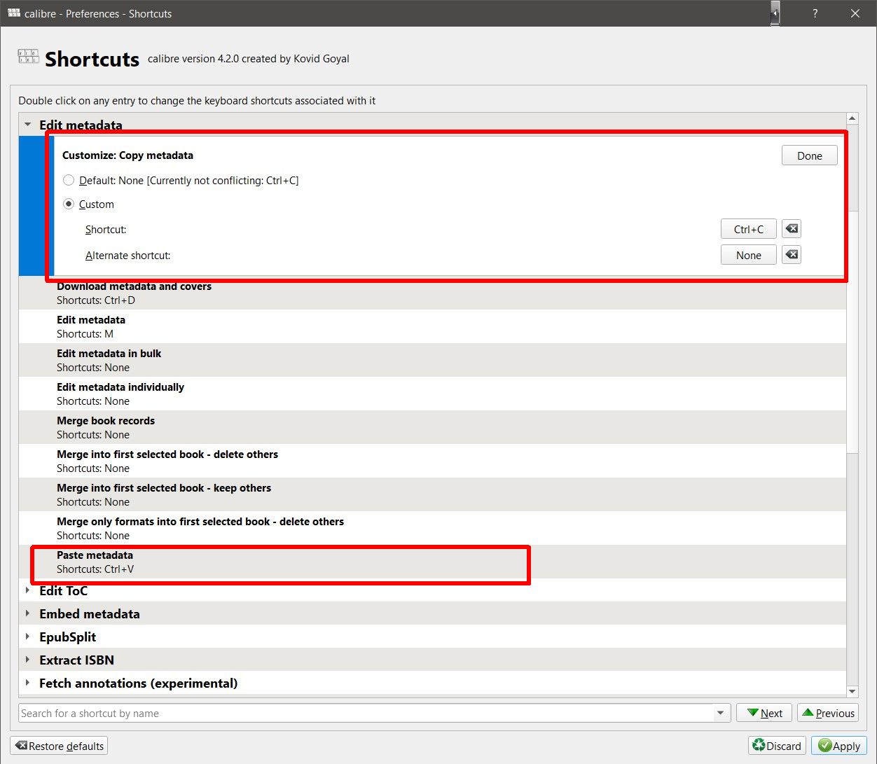 You need to set the kbd shorts - probably Cmd+C and Cmd+V And don't forget the tweak You use it on the book list; select the book who's metadata you want to copy, then press Cmd+C, select the book into which you want to paste the copied metadata, then press Cmd+V. BR Last edited by BetterRed; 10-28-2019 at 06:15 AM. |