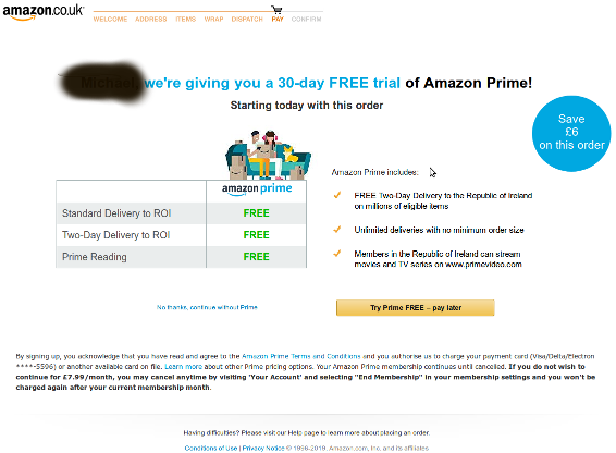 They got told off in UK for the payment page. So now on UK Market place they only serve it to Irish Customers (who despite Euro are sent to UK Sterling site with Amazon hedged conversions only at checkout, I cancel that and pay in sterling) Spot the real check out link? It's the small blue text to the left of the button. It's called Dark Arts UX and is immoral. |