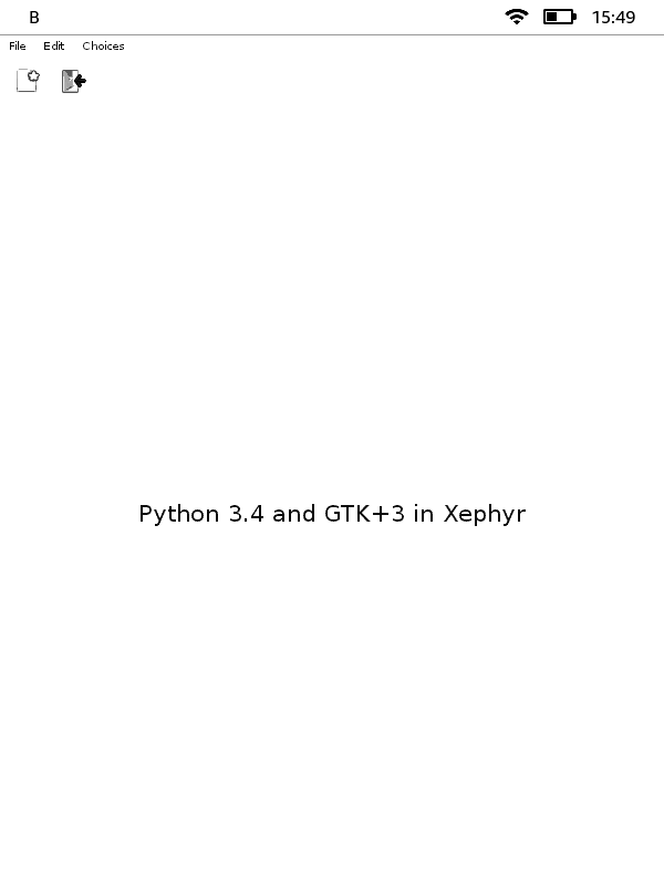 On the advice of @NiLuJe, I removed Python from the equation entirely and compiled a minimal GTK3 application to see whether the problem lay with Python or GTK3. When I ran my compiled binary, I had the same outcome as before - the titlebar turned invisible but none of the widgets were drawn. However, when I ran my application within Xephyr, it worked perfectly. I also tried to run one of the Python/GTK examples within Xephyr and I had different results depending on whether I was within a debian chroot or not. Outside of the chroot, GTK tried to load fontconfig definitions from the usual system path and failed with a bunch of errors like this: Code: