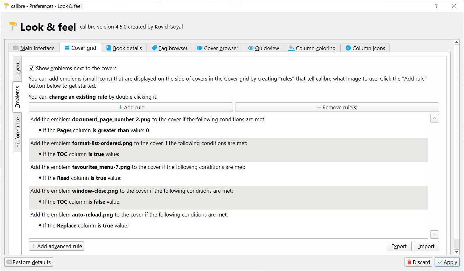 I assume there is no way to put the emblem "on top" of the cover image. That is superimposed, not above it, it would save some space and I could get more book covers on one screen. @DoctorOhh - What are your settings to get your covers so close, I messed with the spacing between covers and the , cover size options but couldn't get anything that was a "tight" as the screenshot you posted, also didn't see an option to get all covers set to same height width even if I change the Cover Width and Cover Height options manually they still show up with different aspect rations (that is some wider and some taller, are yours all the same resolution to begin with or am I missing something. Thanks. |