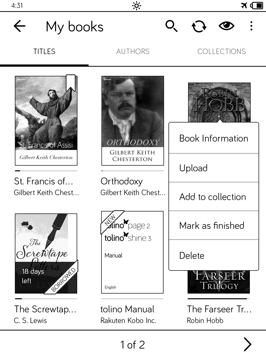 I've attached three images. One shows the Upload option, the second shows the book information (showing that the book is on the Device and the Cloud) and the same books on my Tolino Android app (on a phone). You can see on the app that the one book hasn't been downloaded to the phone, hence the Cloud with the Down Arrow. Last edited by rcentros; 12-24-2019 at 08:07 PM. |