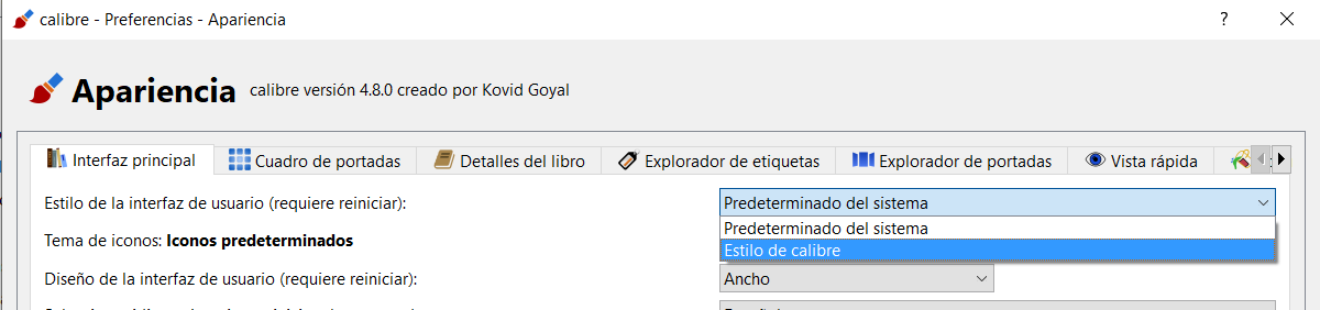 In windows the user interface style appears where I can choose default by the system or caliber style. But in linux that option does not appear see first windows image, second linux image. The question is: how could I activate the dark theme in linux. Caliber version 4.8 Linux mint 19.3 with dark theme From already thank you very much. |