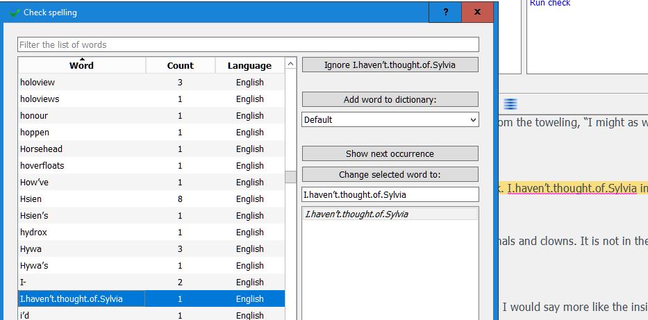 I use the Reports tool to look for unexpected Words and Characters before I spellcheck. Where unexpected varies depending on genre e.g. I wouldn't expect to find a '~' in novel but it might be legit in an economics text to mean approximate. Seems you're using a small screen. You might want to get a tool that will let you rollup the spellcheck window after you double click into the code window. On Windows I use Actual Tools Buttons, it's not free but it's worked for me since XP days so I'm sticking to it. Pretty sure there are zero-cost equivalents these days. To roll up/down I just press Ctrl+Win+R. BR |