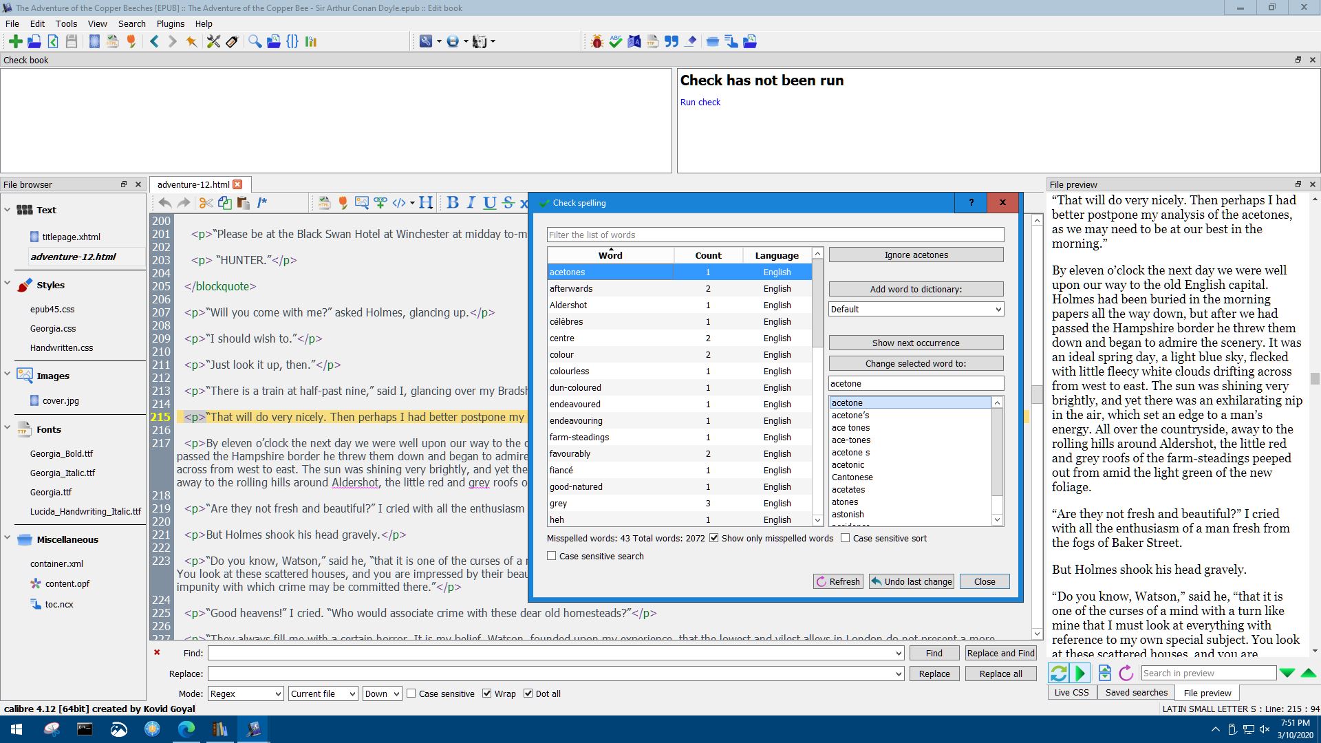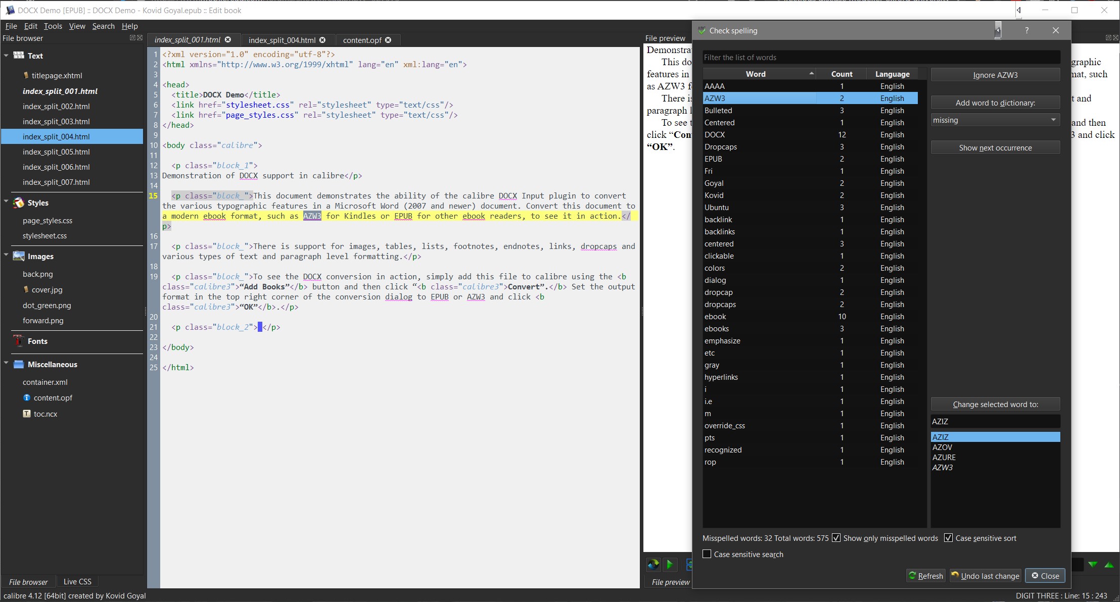 1. The spelling word list usually hides the text with the misspelled word 2. Misplaced punctuation in a word is flagged, so why not show the user the entire word, including the symbol? 3. I usually just give up and change the book language to en-GB Quote: