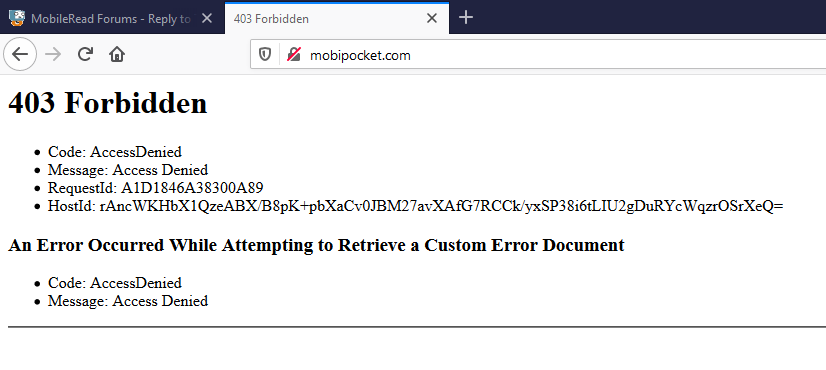 I just downloaded Mobipocket to my Windows 10 machine. When I click on eBook Store or eNews Store I get the message "403 Forbidden