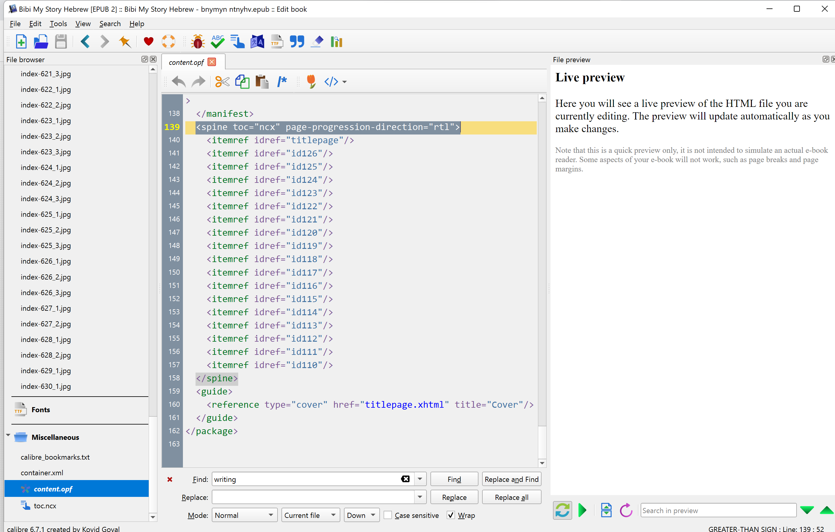 im trying to work with a hebrew text which goes from right to left. i followed the instructions on the thread and in the OPF file i changed the following: <spine toc="ncx" page-progression-direction="rtl"> it didnt seem to work for me. please see screenshot below. Thank you! |